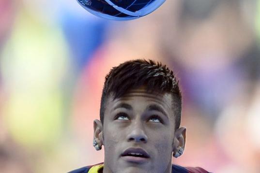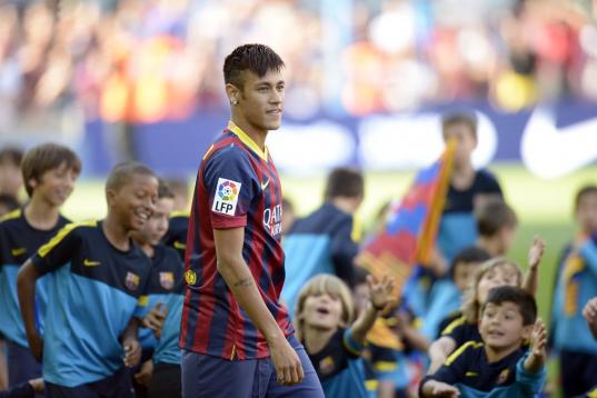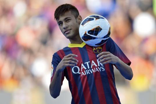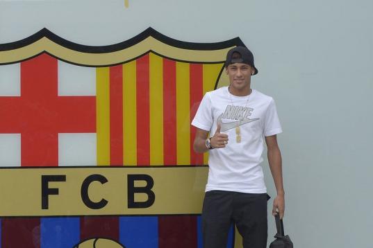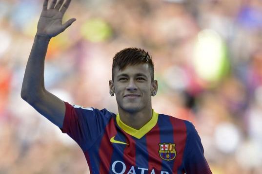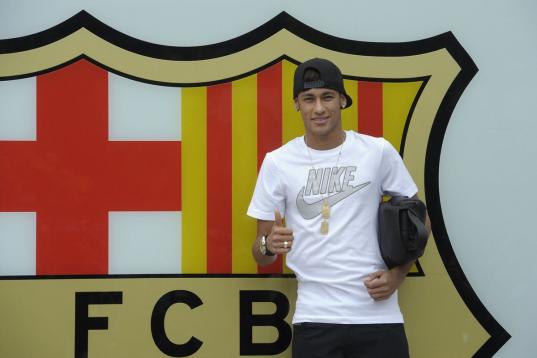 Barcelona's new player Brazilian Neymar da Silva Santos Junior poses for photographers outside Camp Nou's stadium in Barcelona, on June 3, 2013. Santos and Brazil star Neymar signed a five-year contract with Spanish giants Barcelona. AFP PHOTO /...