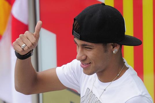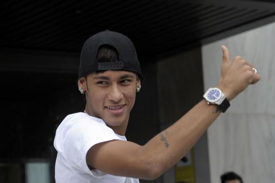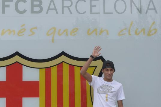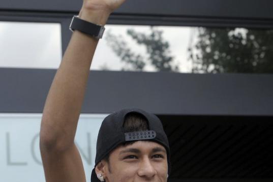 FC Barcelona's new signing Neymar gestures upon his arrival at the club's office at the Camp Nou stadium in Barcelona, Spain, Monday, June 3, 2013. Neymar arrived in Barcelona on Monday to complete his deal with the Catalan club, which will see ...