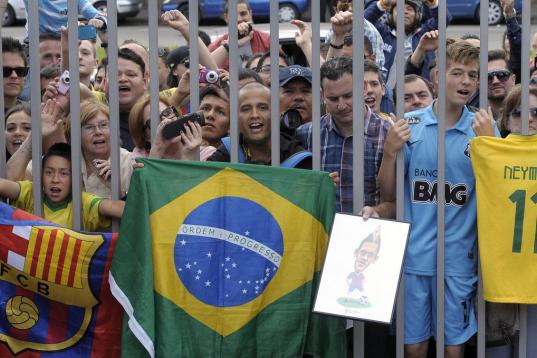 FC Barcelona supporters cheer their new signing Neymar upon his arrival at the club's office at the Camp Nou stadium in Barcelona, Spain, Monday, June 3, 2013. Neymar arrived in Barcelona on Monday to complete his deal with the Catalan club, whi...