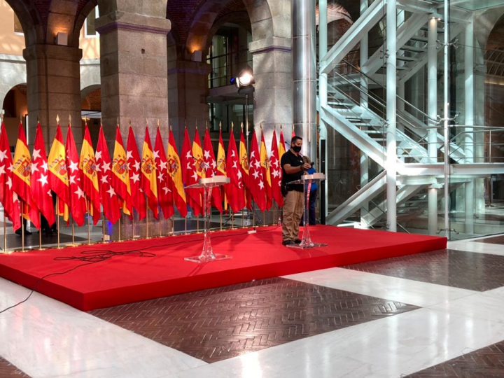 Tras más de dos horas de reunión, Sánchez y Ayuso han comparecido de manera conjunta en la sede del Gobierno regional. Durante esta comparecencia todas las miradas se han dirigido al mismo lugar: a la espalda de los dos mandatarios.
