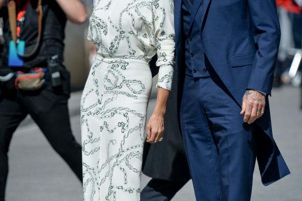 SEVILLE, SPAIN - JUNE 15: David Beckham and wife Victoria Beckham attend the wedding of real Madrid football player Sergio Ramos and Tv presenter Pilar Rubio at Seville's Cathedral on June 15, 2019 in Seville, Spain. (Photo by Aitor Alcalde/Gett...Aitor Alcalde via Getty Images
