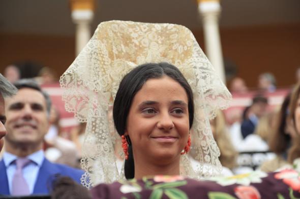 La sobrina del Rey ha llegado este domingo a la plaza de toros de la Maestranza en carruaje, luciendo un vestido en color mostaza de corte clásico, mantilla y mantón de manila con flores bordadas.
