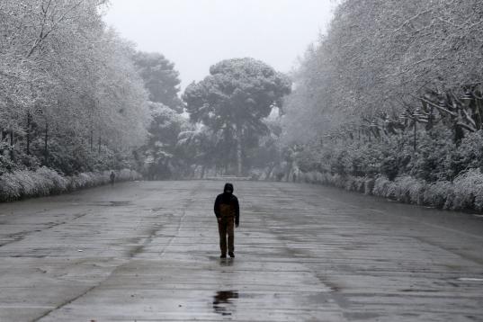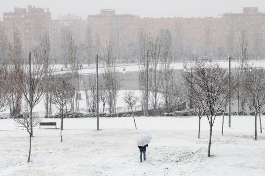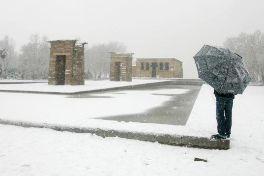 Un hombre con paraguas aparece cerca del templo de Debod, un templo egipcio antiguo reconstruido en Madrid, cubierto por la fuerte nevada.