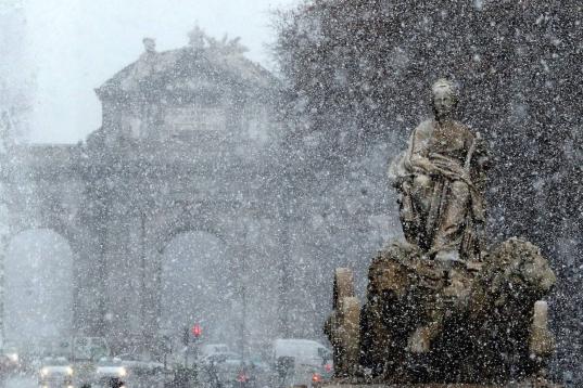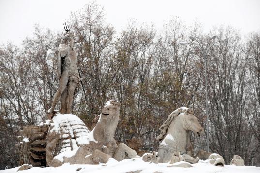 Vista de la fuente de Neptuno durante una copiosa nevada este viernes en el centro de Madrid.