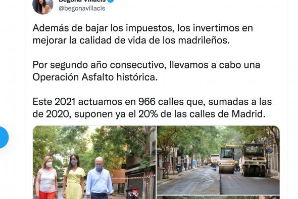 Por eso ha llamado mucho la atención el mensaje que ha publicado en su cuenta de Twitter la vicealcaldesa de Madrid, Begoña Villacís, en la que ha sacado pecho de la “operación asfalto histórica” que el Consistorio está llevando a cabo.