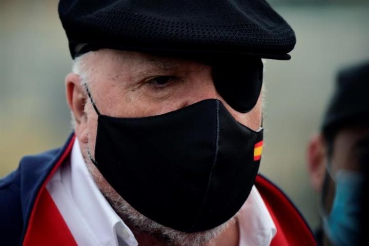 El excomisario de Policía ha aparecido con una boina, una mascarilla con la bandera de España y un parche en el ojo derecho, después de los problemas de visión que sufrió hace unas semanas y que requirieron su ingreso en un hospital.
