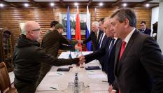 Un refugiado trata de calentarse con un fuego en la frontera ucraniano-polaca
