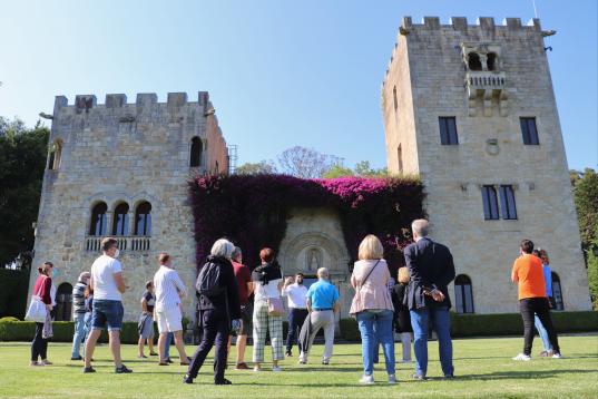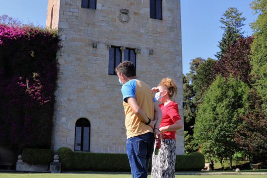 Continúa la visita por la vasta finca hasta llegar a la fachada que presiden las conocidas como torres de Meirás, un añadido a la estructura completamente diseñado por dos mujeres, Emilia Pardo Bazán y su madre. La parada no es casualidad, pues ilustra a la perfección las dos esencias que conviven en Meirás. Por un lado, la de una figura femenina revolucionaria para su época y autora hasta de los detalles de las vidrieras y los motivos ornamentales de un edificio que se convirtió en centro cultural entre 1907 y 1921. Y por otro lado, la de un señor cuya única aportación es un escudo de armas autootorgado colocado bajo el balcón de las musas.