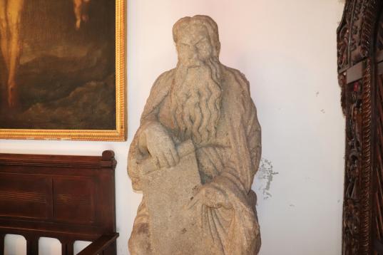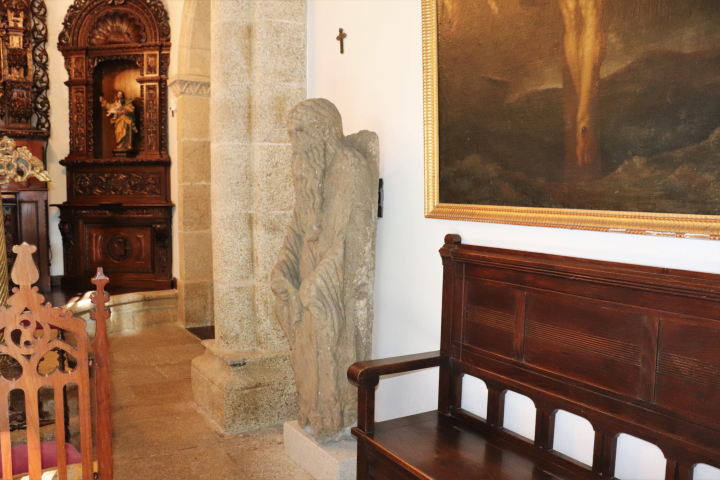 Dentro de ésta, el técnico de Turismo confirma lo que todos ya sabían y esperaban ver. En los laterales se hallan las dos estatuas del maestro Mateo, autor del Pórtico de la Gloria de la catedral de Santiago de Compostela. Desaparecidas hasta la década de los 40, el Ayuntamiento las adquirió en esa época “con la mala coincidencia de ese día pasaban Franco y Polo por allí”. El retablo barroco que preside el ábside se trajo del pazo de Santa María de Sada, pero eso hay que perdonárselo al dictador, puesto que es el pago de una deuda con la autora de La cuestión palpitante. “Como cada uno empiece a pedir lo suyo hay que desmontar medio pazo”, se escucha comentar en el grupo.