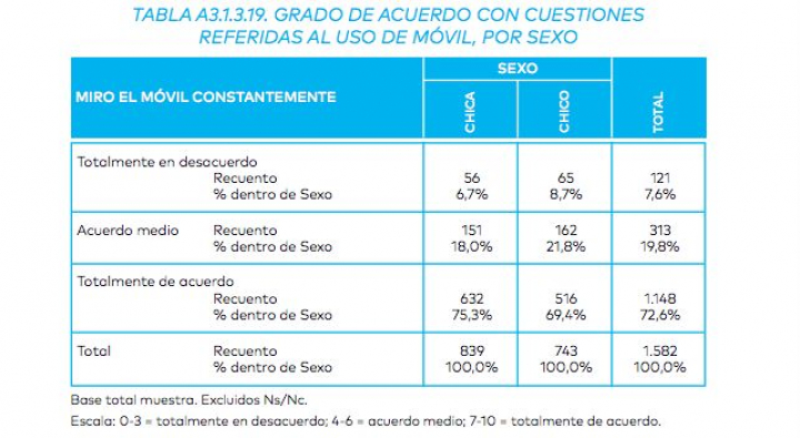 El problema que apunta es real. Su gravedad ha llevado a analizarlo a la Fundación de Ayuda contra la Drogadicción (FAD) desde la perspectiva de la juventud. En su informe Las TIC y sus influencias en la socialización de adolescentes profundiza en los hábitos comunicativos de una amplia muestra de chavales de 14 a 16 años a través de una serie de variables. Una de ellas, bajo el epígrafe “miro el móvil constantemente”, fue respondida “totalmente de acuerdo” por un 72,6% de los adolescentes encuestados (75,35 de chicas).