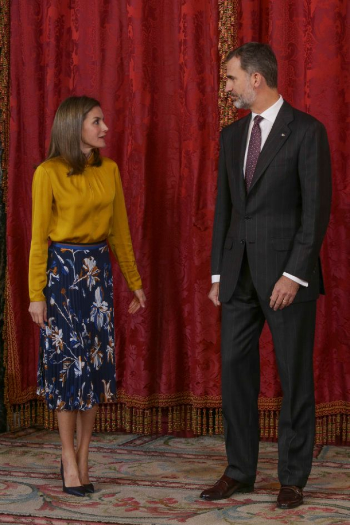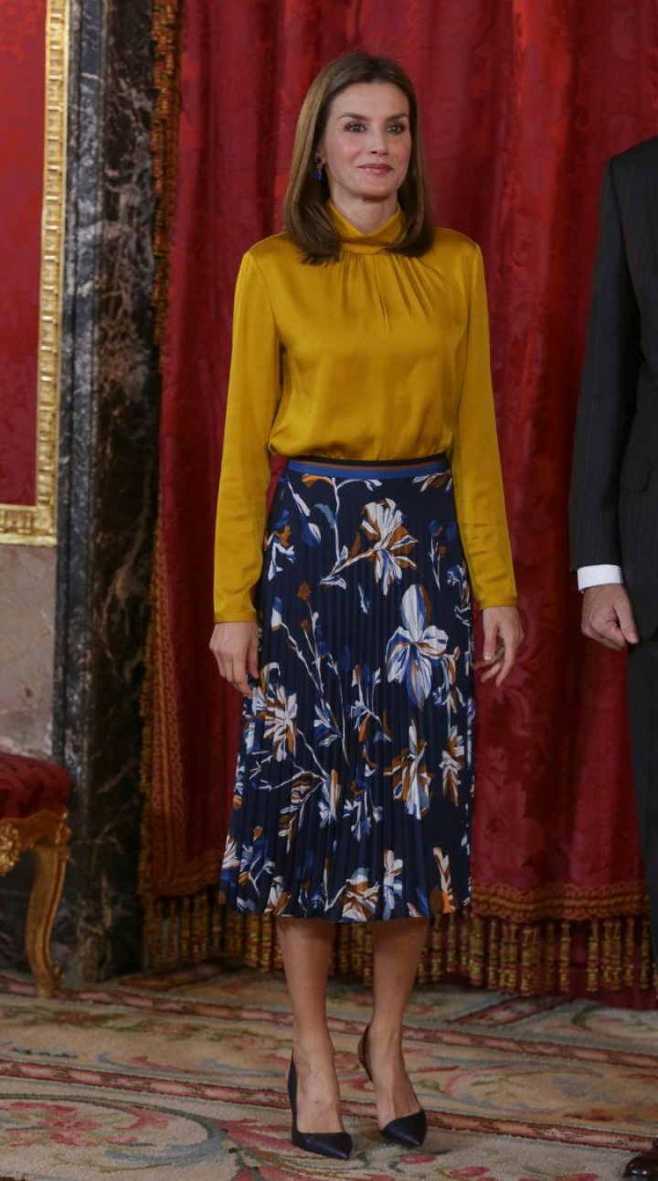 "Letizia llevaba una falda midi con pliegue acordeón y flores de gran tamaño en azul marino, color herrumbre y azul cerúleo", señala la publicación. Sobre la blusa, apunta que era "apropiada para el ligero descenso de las temperaturas".