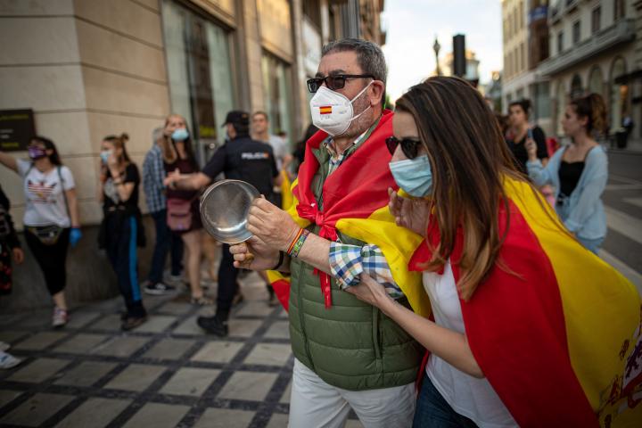 La segunda, la de las cacerolas, se da desde hace una semana aproximadamente. Se trata de una convocatoria de la derecha para pedir la dimisión de Pedro Sánchez y el fin del estado de alarma. Desde que comenzó a darse esta situación, en el barrio Salamanca —la Milla de Oro de Madrid—, la convocatoria se ha vuelto diaria y seguida en varias ciudades del país.