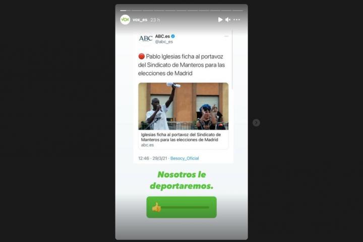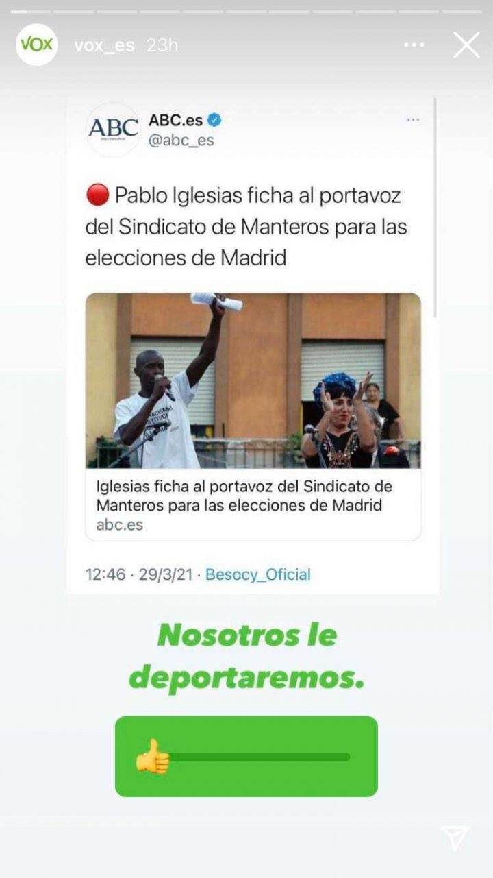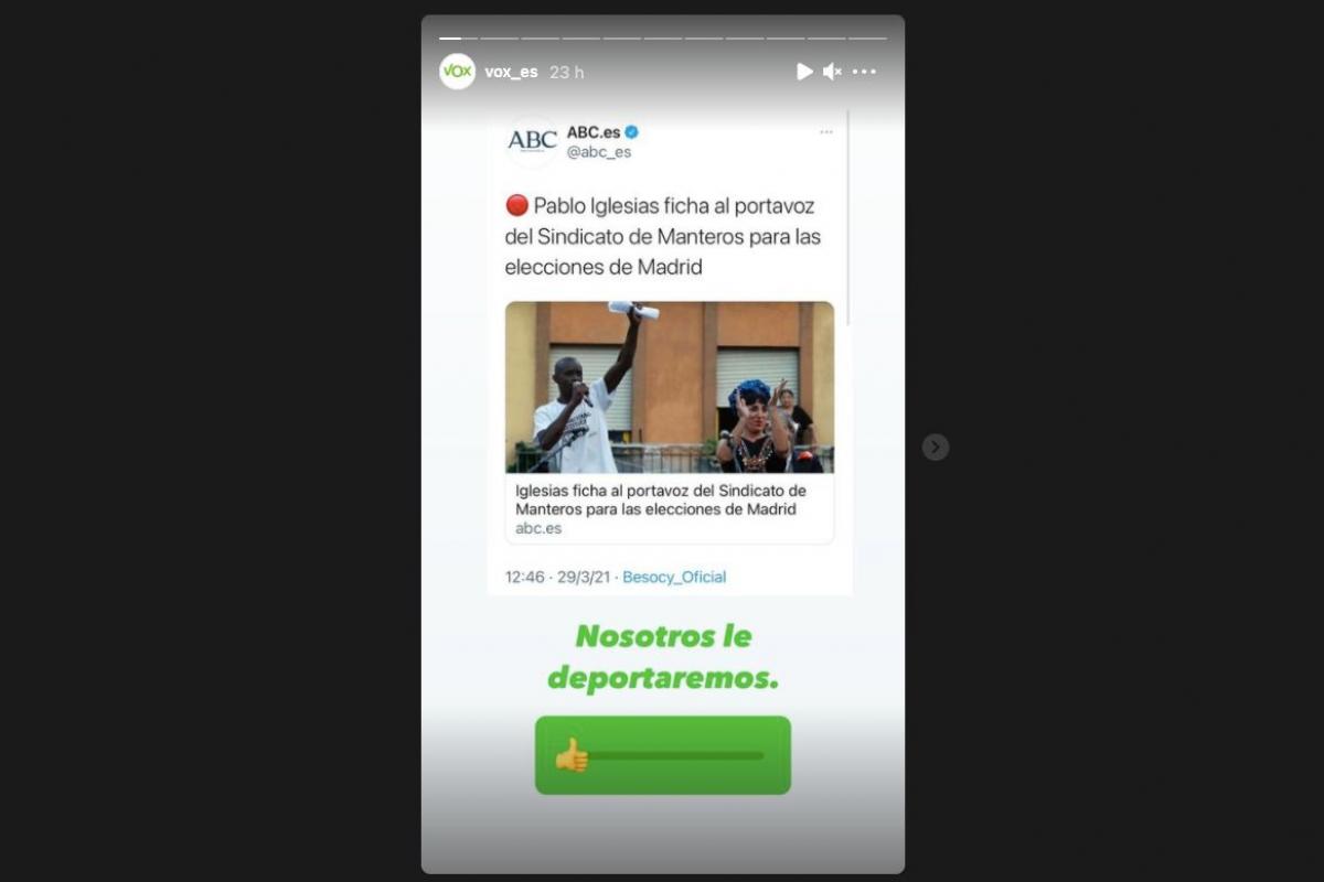 Este lunes trascendió que Iglesias fichaba a Mbayé para su lista electoral en calidad de independiente. El problema ha sido la respuesta de la ultraderecha que, en una historia en Instagram, ha asegurado que se desharán de Mabyé: “Nosotros le deportaremos”.