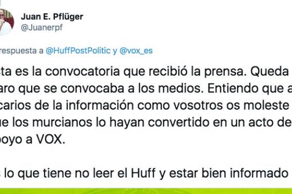 Juan E. Pflüger, responsable nacional de prensa de Vox, ha acusado a El HuffPost de ser “sicario” por calificar de “acto” un acto celebrado este jueves por Vox en Murcia. Según Pflüger no era un “acto”, sino “una rueda de prensa” que finalmente ha congregado a medio millar de personas, según cifras aportadas por la Agencia EFE.