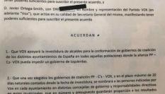 Vox ha enseñado este martes el acuerdo con PP y Ciudadanos en el que se habla de “gobiernos de coalición”, y lo ha hecho para denunciar que ambas formaciones lo han incumplido y que, en consecuencia, lo da por “roto” en las ciudades en los que se haya aplicado.