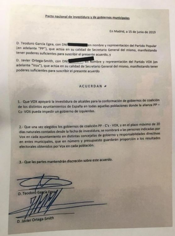 Vox había amenazado con hacer público el acuerdo suscrito con PP y con Cs para diversos consistorios, en especial para el de Madrid dada su relevancia. Lo ha hecho este martes debido a lo que estiman es un “flagrante” incumplimiento en la capital española; lo firman el secretario general de los populares, Teodoro García Egea, y el de Vox, Javier Ortega Smith.