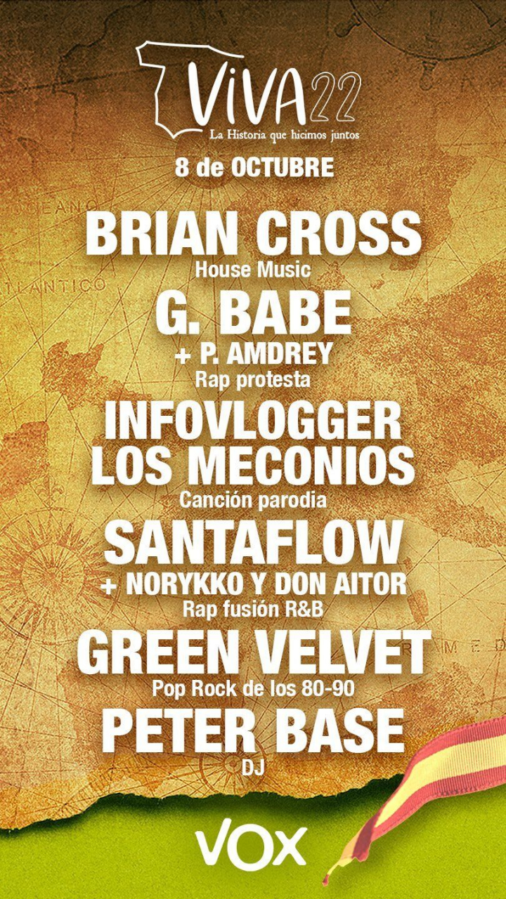 El personaje más mediático es el DJ catalán Brian Cross, que ha trabajado en el pasado junto a estrellas de la música como Ricky Martin, Yandel, Sophie Ellis Bextor, Inna o Lali Esposito, entre otros. El DJ nunca se ha pronunciado políticamente, aunque no ha dudado en publicitar su participación en Viva22 a través de sus redes sociales. Junto a él, aparecen discretos representantes del rap protesta como G. Babe (un negacionista del covid que en uno de sus temas incluye una grabación de un discurso del líder neonazi español Pedro Varela) o P.Amdrey, con no más de 2.000 oyentes mensuales en Spotify.