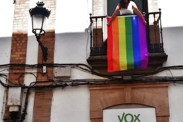 En un balcón de la céntrica calle Rábida de Huelva, a escasas manzanas del Ayuntamiento de la ciudad, luce desde el pasado lunes una bandera LGTBI. Sería una más de las muchas que adornan los balcones de toda España en plena semana del Orgullo de no ser por los vecinos del local de abajo: la formación ultraderechista Vox.