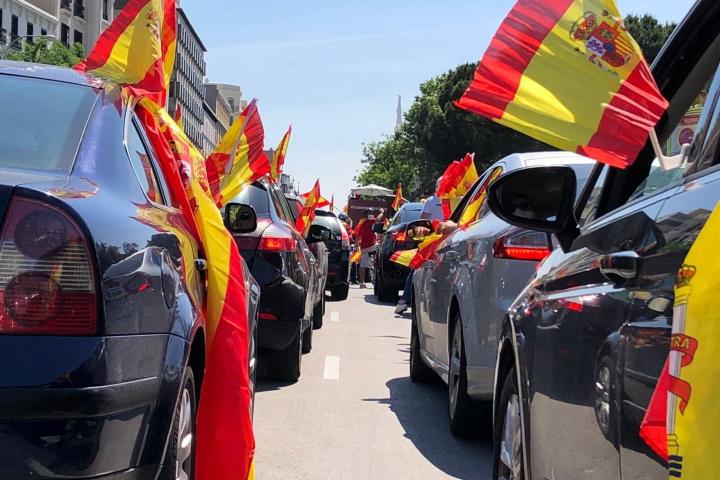 Mientras los dirigentes de la ultraderecha esperaban, llegaban manifestantes como Paula Vega, economista de 28 años y residente en céntrico barrio de Chamberí. Mientras colocaba una bandera de España en el techo de su Mitsubishi negro se lamentaba de que “este Gobierno haya mentido”. “Somos autónomos. Nos han dejado en la cuneta. Este país es una vergüenza. No nos tenemos que quedar aquí confinados aunque salve vidas, que eso es lo que nos han contado. Tenemos que volver a remontar la economía”.