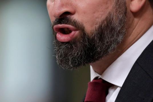 La mirada de Santiago Abascal a Pablo Iglesias y Pedro Sánchez.