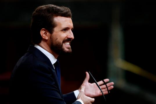 El líder del PP, Pablo Casado, es ovacionado por los miembros de su grupo parlamentario tras su intervención.