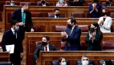 El líder de Vox, Santiago Abascal, aplaudido por su bancada tras su intervención.