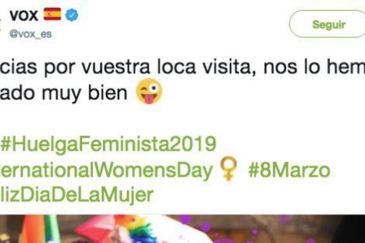 "Gracias por vuestra loca visita, nos lo hemos pasado muy bien", han escrito en Twitter desde el partido, utilizado los hashtags de esta jornada de reivindicación. La publicación está acompañada por un vídeo que comienza con el rótulo "Feminazis visitan Vox".