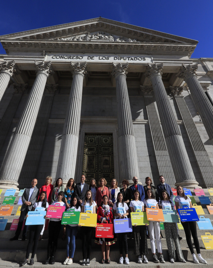 Han participado en la imagen la presidenta del Congreso, Meritxell Batet, miembros de la Mesa y diputados de varios grupos, como Ana Pastor (PP), Patricia Reyes (Ciudadanos), Alfonso Rodríguez Gómez de Celis (PSOE) o Gloria Elizo (Unidas Podemos), quienes hoy han cedido su voz a las niñas y han renunciado a hacer declaraciones.