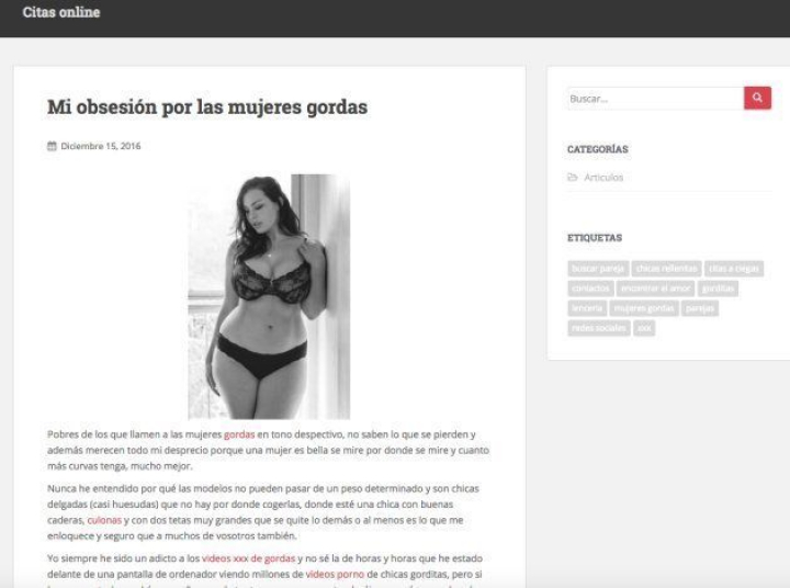 La primera entrada de esa página, que en realidad es un blog, es un artículo escrito el pasado 15 de diciembre titulado Mi obsesión por las mujeres gordas, en el que aparece una mujer en ropa interior.