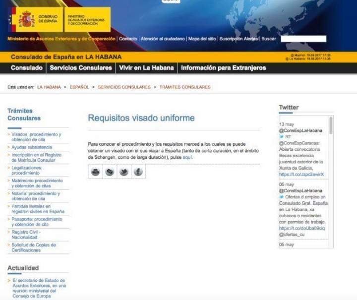 Cualquiera que este viernes se haya planteado pedir visado en la página web del Consulado de España en La Habana para viajar a España se habrá encontrado con la misma sorpresa: el enlace donde se supone que debería de haber una página con los requisitos y el procedimiento es en realidad una página de citas online.
