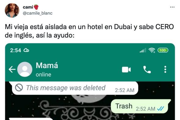 “Mi vieja está aislada en un hotel en Dubai y sabe CERO de inglés, así la ayudo”, ha contado la usuaria @camile_blanc. Para demostrarlo, adjuntó un pantallazo de las conversaciones que está manteniendo con ella.
