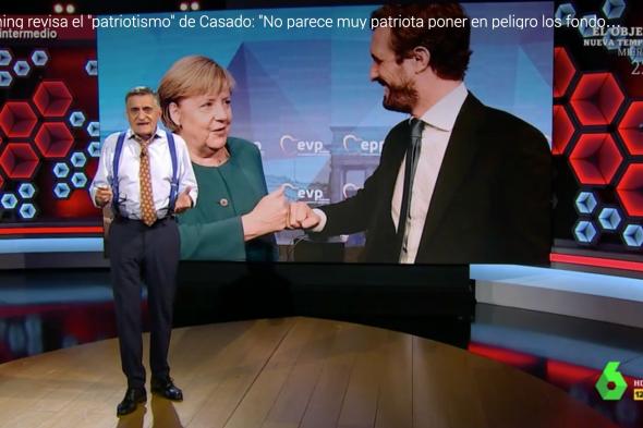El Gran Wyoming ha dedicado el inicio de El Intermedio a analizar el papel de Pablo Casado en el extranjero. El líder del Partido Popular ha hecho varios viajes con los miembros del PP europeo en los que ha criticado al Gobierno de España, al que ha tildado de “radical” y del que ha dicho que no va a hacer buen uso de los fondos europeos.