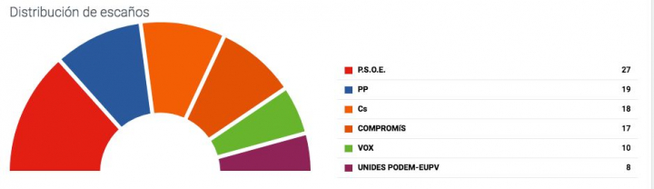 Los socialistas valencianos podrán así reeditar el Pacte del Botànic, que llevó a Puig a la presidencia, junto con Compromís (17) y Unides Podem-EUPV (8). Las tres formaciones de izquierdas suman 52 escaños, dos por encima de la mayoría absoluta.