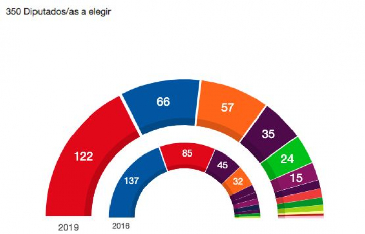 En el primer gráfico puedes ver los resultados de los comicios con el 96% escrutado. En el de abajo, la predicción que hizo Tezanos:
