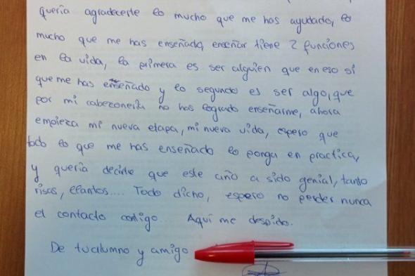 "Y llegó el día, aquí se separan nuestros caminos. Quería darte las gracias por este año junto a ti, eres una persona increíble, además del mejor profesor, el mejor amigo que un chico de 16 años puede tener. Quería agradecerte lo mucho que me has ayudado, lo mucho que me has enseñado. Enseñar tiene dos funciones en la vida: la primera es ser alguien, que en eso sí me has enseñado; y la segunda es ser algo, que por mi cabezonería no has logrado enseñarme. Ahora empieza mi nueva etapa, mi nueva vida, espero que todo lo que me has enseñado lo ponga en práctica, y quería decirte que este año ha sido genial, tanto risas, llantos... Todo dicho, espero no perder nunca el contacto contigo. Aquí me despido".