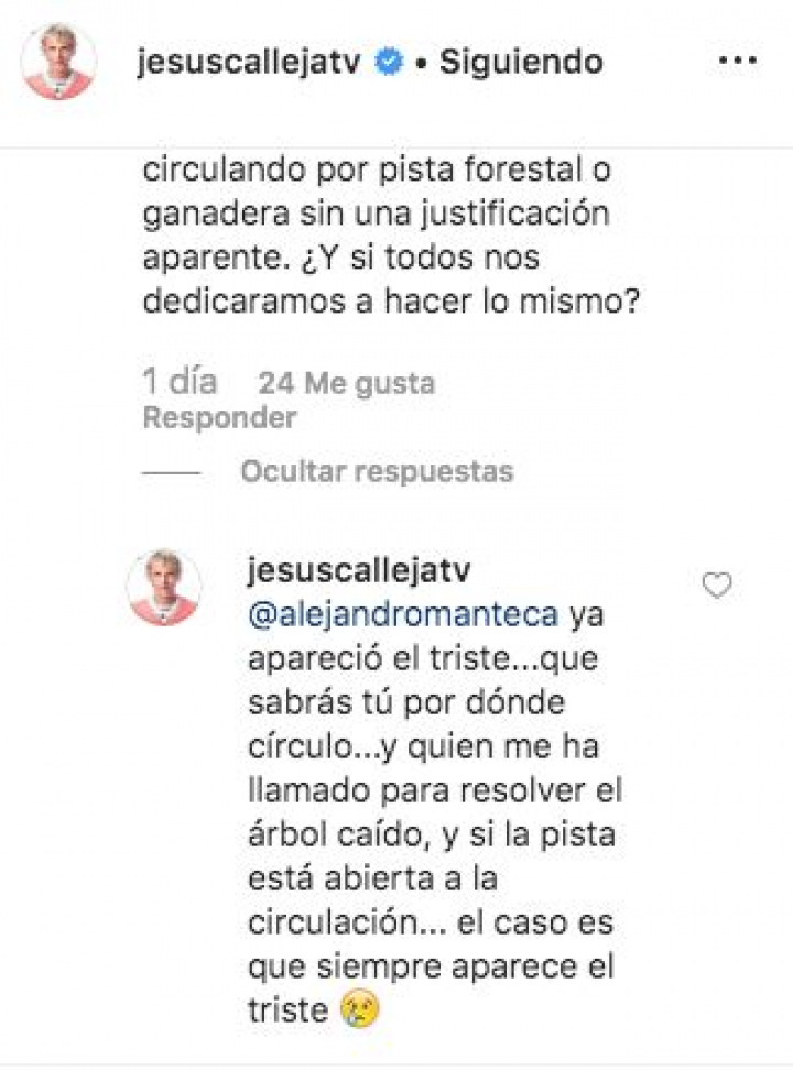 Comentario que no gustó nada de nada a Calleja, que respondió de la siguiente manera: “ya apareció el triste...qué sabrás tú por dónde círculo...y quién me ha llamado para resolver el árbol caído, y si la pista está abierta a la circulación... el caso es que siempre aparece el triste”.