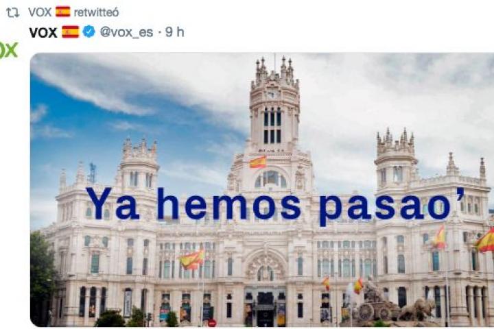 "Ya hemos pasao": el tuit de Vox tras su resultado en Madrid que indigna en redes