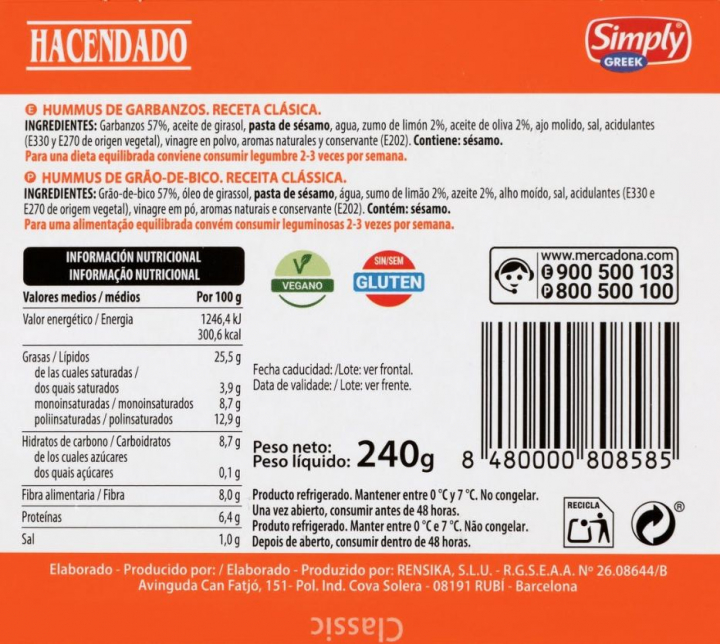 Si se mira la etiqueta trasera del producto se puede ver que es fabricado por Rensika, el mismo fabricante del hummus de Mercadona: