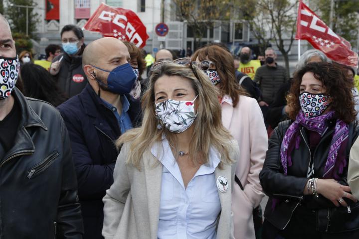 La vicepresidenta tercera ha dicho estar “feliz” de estar presente en la manifestación y ha subrayado que el protagonismo es de los trabajadores y los sindicatos.