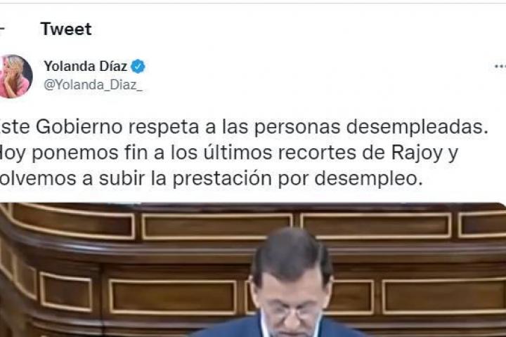 Al hilo de estos avances, Díaz ha rescatado, y publicado en su cuenta de Twitter (@Yolanda_Diaz_), un vídeo de una intervención de Rajoy en el Congreso de los Diputados que se contrapone, precisamente, con las políticas sociales del ministerio de Trabajo. El tuit ha recopilado en apenas una hora más de 20.000 reproducciones.