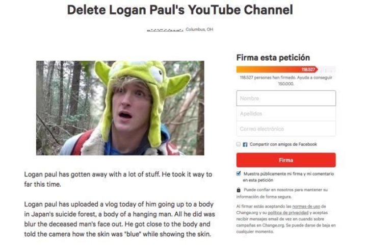 "No se trata de ti, Logan Paul. Un hombre con familiares y amigos eligió ponerle fin a su vida y tú decidiste compartir su muerte con millones de seguidores sin pensar en cómo se sentían esos familiares y amigos. Es repugnante y no debería tolerarse. Gracias al poder de internet, podríamos acabar con esta mierda de una vez por todas, con la ayuda de la firma de esta petición se podría eliminar su canal".