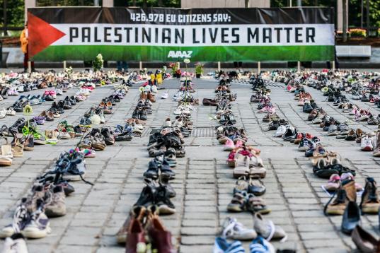 Una instalación con 4.500 zapatos organizada por la ONG Avaaz en el centro del barrio europeo de Bruselas ha denunciado hoy la situación en Gaza, coincidiendo con el Consejo de ministros de Exteriores de la Unión Europea (UE) en el que se aborda el conflicto palestino-israelí.
