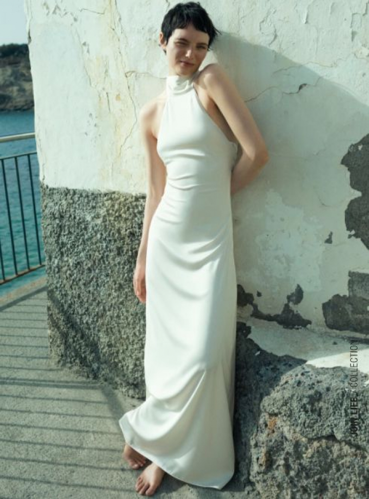 El diseño de Inditex luce el mismo cuello halter y escote en la espalda pero el vestido de cierra en la parte trasera del cuello con un gran lazo de satén que cuelga hasta los pies. La prenda, que está fabricada en color blanco roto y tejido satén, cuesta 129 euros y ya se ha agotado en la talla XL.