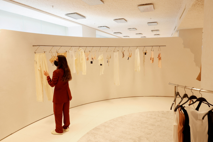 La tienda está plagada de árboles, arreglos florales y hasta tulipanes frescos en la planta de hombre que rompen con los materiales blancos o grises que son mayoría, a excepción de alguna madera. “Parece que se va a caer”, dice una joven del techo gris y rugoso.