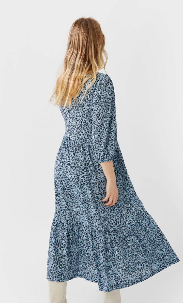 El vestido de Stradivarius tiene una silueta prácticamente igual: manga francesa, un corte en la zona de la cintura y falda con volante en la parte inferior. A diferencia del de Zara, la marca ha presentado el modelo en varios colores además del blanco. Las fans de la prenda pueden comprarlo en beige o verde con lunares negros, y en negro con lunares blancos. Además, la firma ha decidido aprovechar la exitosa silueta y ponerlo a la venta también con un estampado de flores azules.