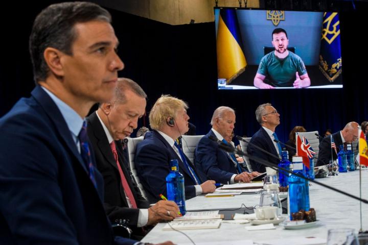Era la intervención más esperada de la mañana. El presidente ucraniano, Volodimir Zelenski, conectaba por videoconferencia en la Cumbre de la OTAN, en Madrid, para lanzar a los aliados y sus socios mensajes concretos, exigencias necesarias para frenar los avances rusos en la invasión de su país. El exactor, metido en un papel que nunca hubiera imaginado, lleva más de cuatro meses interviniendo online en pleno de cámaras de medio mundo, así que el contexto ya se sabía: la guerra es de todos, afecta a todos, y todos deben ayudar a pararla. Hoy iba a lo concreto.