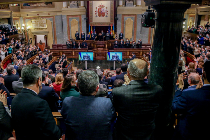 17.18 horas del martes 5 de abril. Las Cortes Generales en pie. Un aplauso doloroso, pero también de ánimo y resistencia. Volodímir Zelenski aparece en cuatro pantallas gigantes colocadas en el Hemiciclo del Congreso. Su luz se mezcla en el aire con el fresco de las alegorías de la fortaleza y de la templanza. El dolor se cruza por todo el mundo, también en una España impactada por la imágenes de la masacre de Bucha.