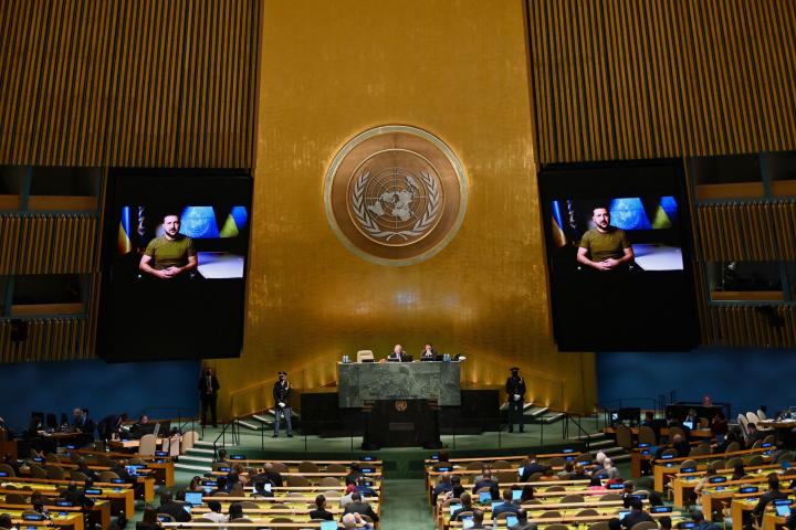 El pasado 16 de septiembre, 101 países aprobaron una resolución para que Zelenski interviniera a través de un video pregrabado en la Asamblea General de Naciones Unidas. Llegado el momento, el presidente de la sala ha nombrado al ministro de Exteriores, Dmytro Kuleba, que ha sido el encargado de anunciar el discurso de su presidente.