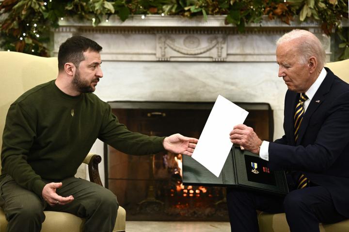 Pero el agradecimiento de Zelenski se ha concretado en un objeto. Vestido de camuflaje militar, el uniforme que no ha abandonado en diez meses, el político ucraniano ha obsequiado a Biden con una medalla al mérito militar que le había entregado un capital del ejército nacional.