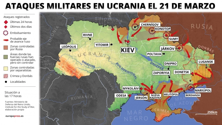 La ciudad portuaria de Mariupol, en el sureste de Ucrania, centra la atención de la guerra con Rusia, en un asedio que se mantiene desde hace días y que tiene visos de prolongarse. Unas 400.000 personas han estado atrapadas en Mariupol durante más de dos semanas en medio de intensos bombardeos que han cortado los suministros centrales de electricidad, calefacción y agua, según fuentes locales.
